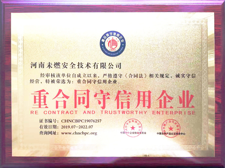 今日,經(jīng)層層考核,全方位審查的“重合同守信用企業(yè)”名單正式出爐,河南未燃安全技術(shù)有限公司憑借著“信譽第一,誠信為本”的公司理念服務(wù)于新老客戶,嚴(yán)格遵守《合同法》相關(guān)規(guī)定,特被榮選為:重合同守信用企業(yè)。