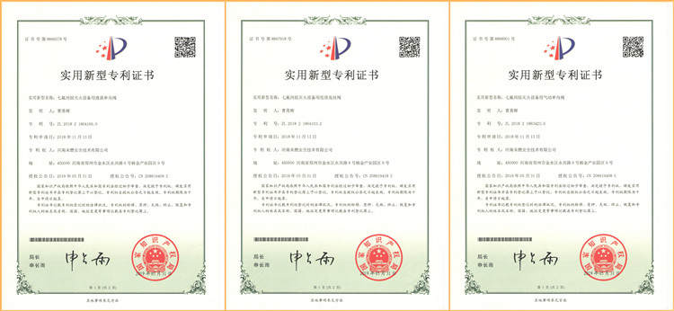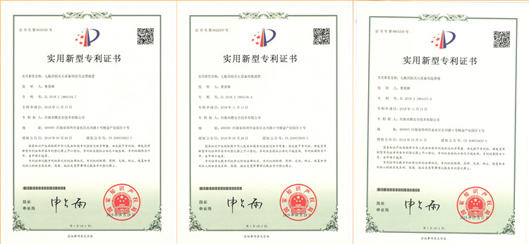 河南未燃安全技術(shù)有限公司于2018年11月13日在原有專利基礎(chǔ)上新增6項(xiàng)實(shí)用新型專利證書(shū),分別為七氟丙烷滅火設(shè)備用信號(hào)反饋裝置,集流管,選擇閥,液流單向閥,低泄高封閥,氣動(dòng)單向閥。該專利證書(shū)于2019年5月份,6月份先后被授權(quán)公告并由國(guó)家知識(shí)產(chǎn)權(quán)局頒發(fā)證書(shū)。