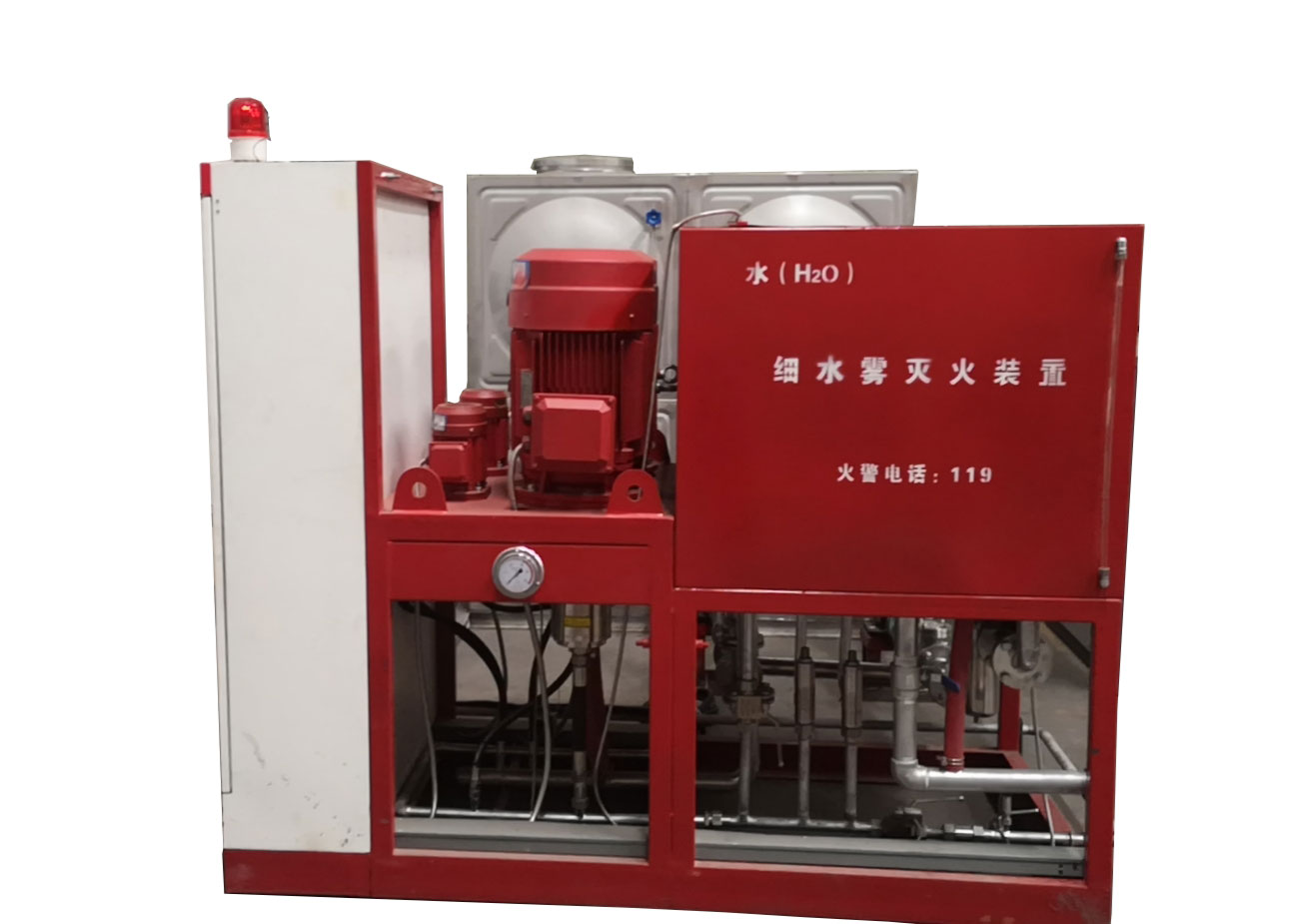 我公司新研發(fā)的高壓細(xì)水霧由高壓細(xì)水霧專用儲(chǔ)水箱、細(xì)水霧滅火裝置泵組單元(包括高壓主泵、高壓備泵、穩(wěn)壓泵、泵組單元控制柜、進(jìn)水電磁閥、進(jìn)水過(guò)濾器、調(diào)節(jié)水箱等)、補(bǔ)水系統(tǒng)、供水管網(wǎng)、細(xì)水霧滅火裝置分區(qū)控制閥箱組、細(xì)水霧噴頭、高壓細(xì)水霧管道及火災(zāi)探測(cè)報(bào)警系統(tǒng)等組成。